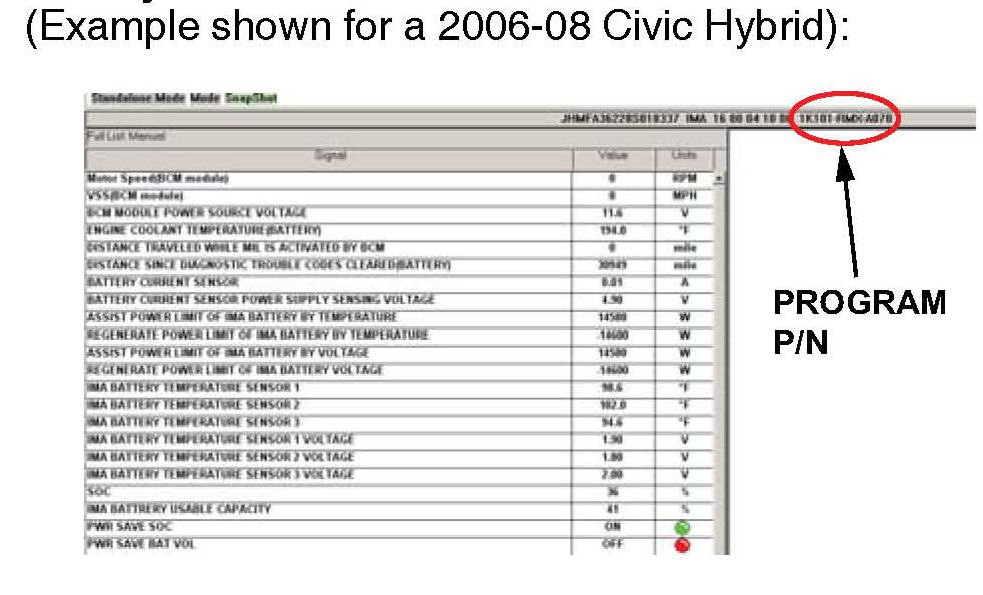 1. Use the Honda Diagnostic System (HDS) to bring up the IMA System Data List. At the top of the Data List screen is the program P/N; this P/N identifies which IMA battery software is currently installed in the vehicle. For example, the HDS IMA Data List screen-shot below shows a program P/N of 1K101-RMX-A070.