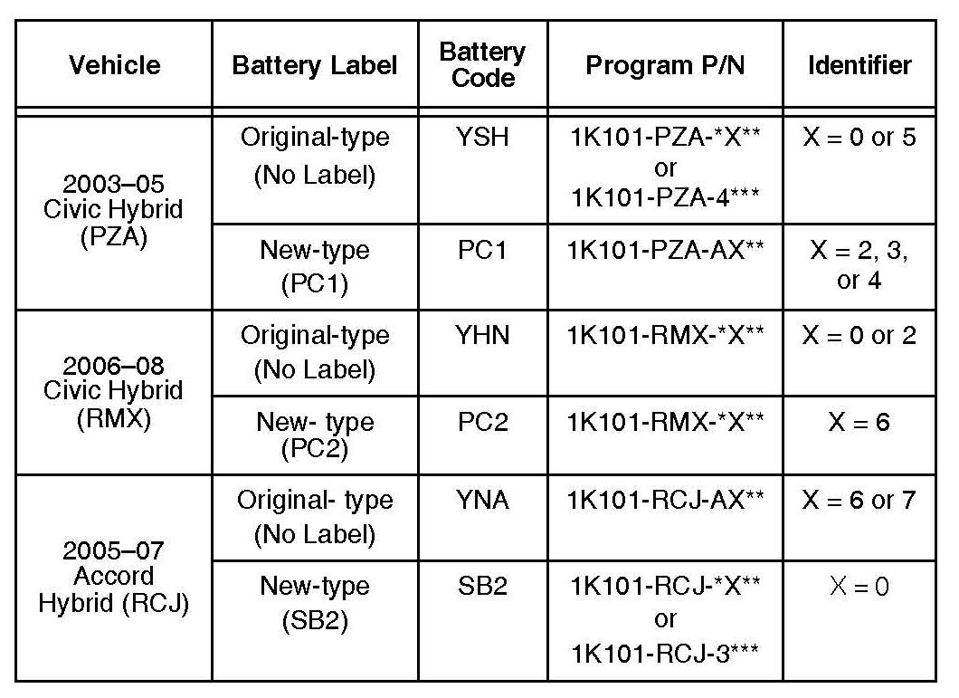 ^ If the replacement IMA battery has a battery code label that indicates it is a "PC2 "it is a new IMA battery type. The existing vehicle's IMA software (battery code YHN) is not compatible with that IMA battery. After that replacement battery type is installed, the vehicle's IMA BCM software must be updated to match the replacement battery type.