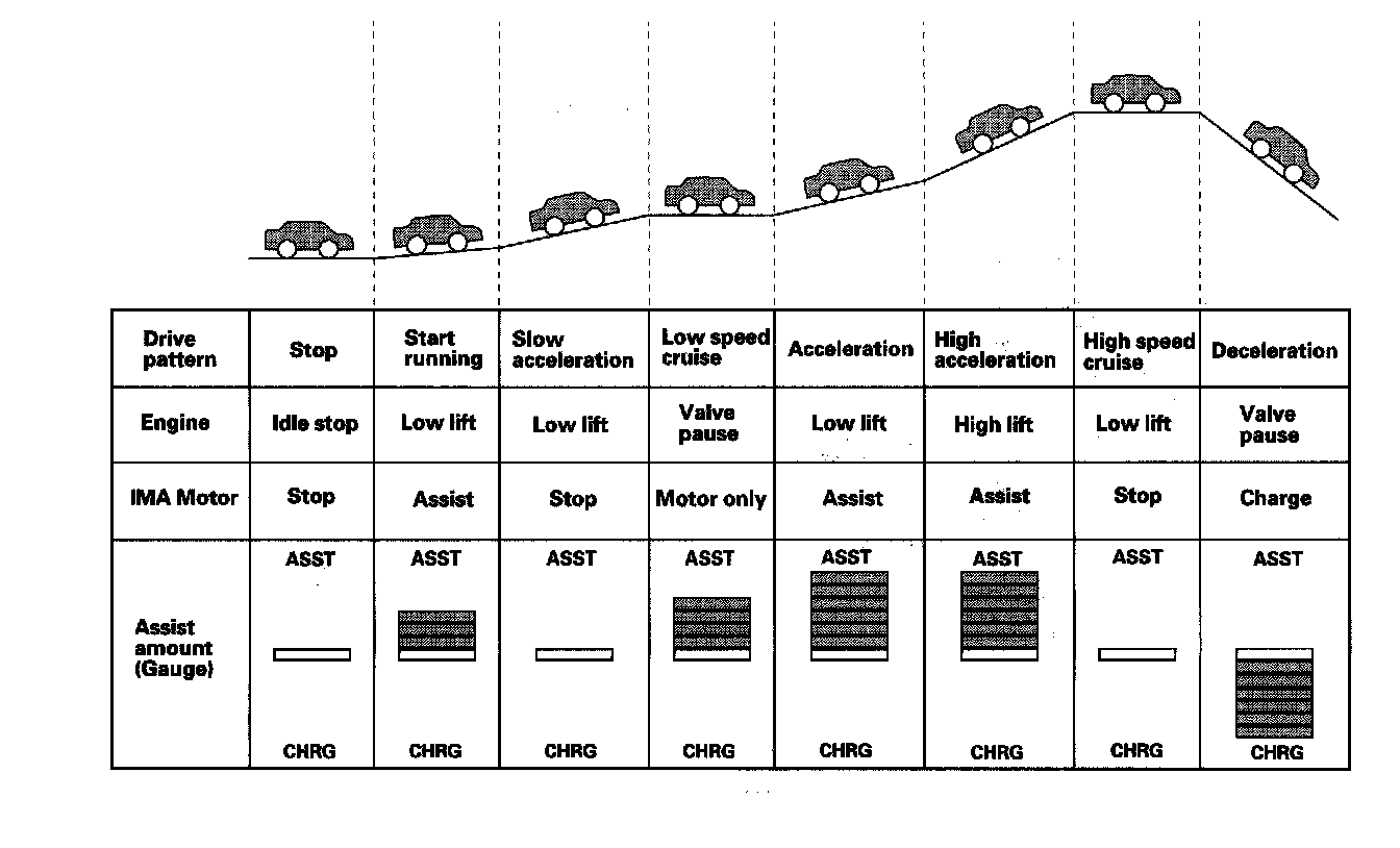 The IMA motor runs the vehicle by itself if the IMA battery is sufficiently charged. The intake and exhaust valves pause to reduce valve spring compression and pumping loss.