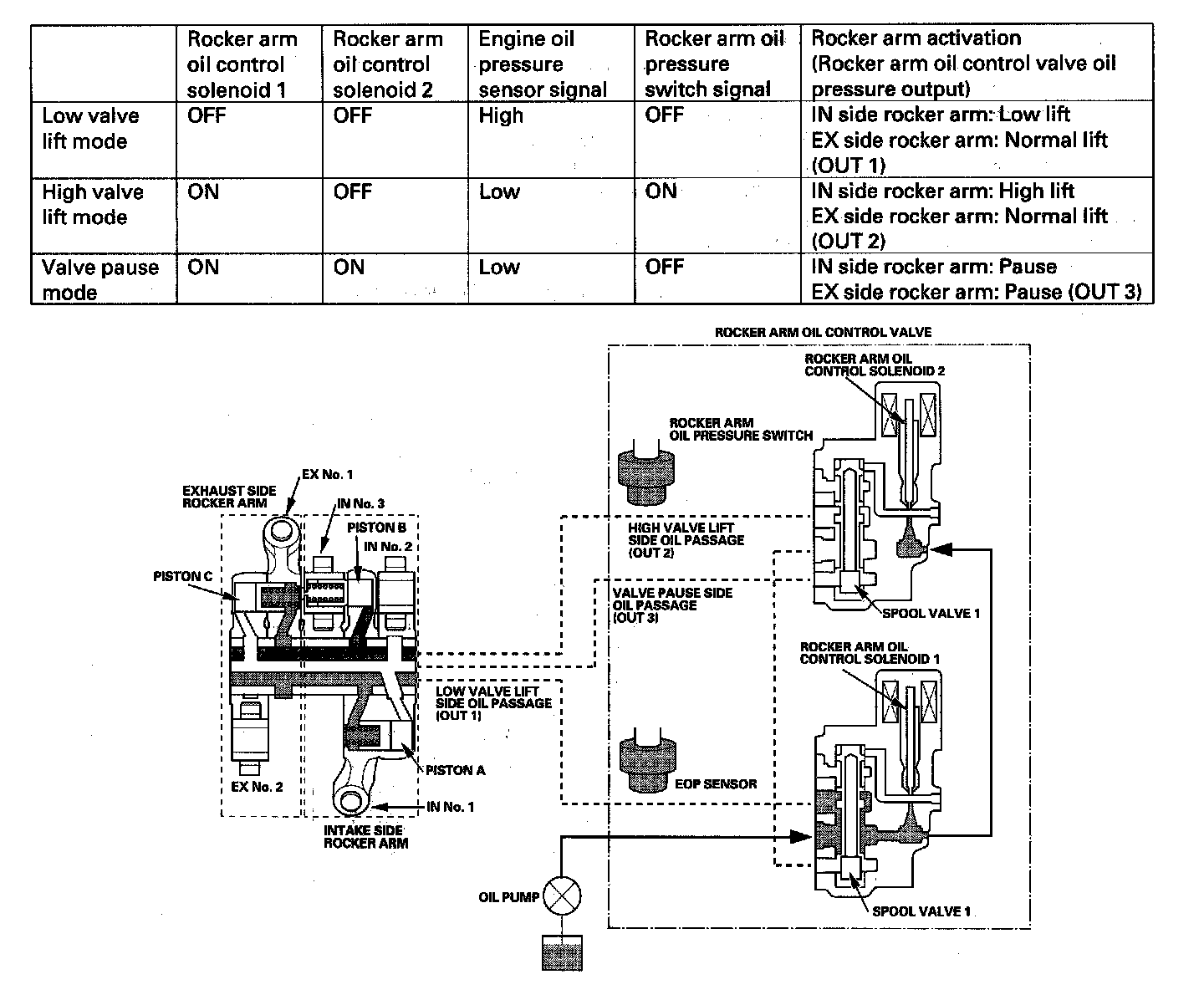 3 Stage i-VTEC SystemThe 3 stage i-VTEC system changes the intake valve lift (low lift, high lift, pause) and exhaust valve lift (normal lift, pause) characteristics to improve fuel economy and power output. There are two rocker arm oil control solenoids in this system to control the engine oil passage that leads to the intake and exhaust rocker arms and controls the intake and the exhaust valve lift. The engine oil pressure is monitored with the engine oil pressure sensor and the rocker arm oil pressure switch.