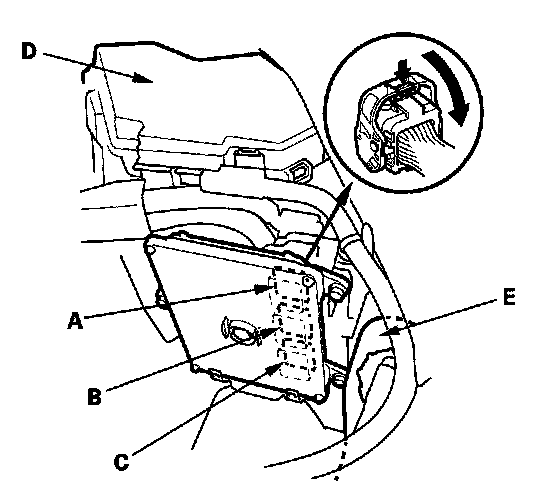 3. Lift up the under-hood fuse/relay box (D).