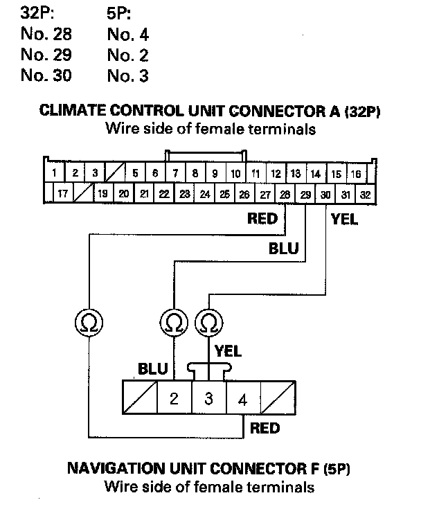 6. Check for continuity between the given terminals of climate control unit connector A (32P) and navigation unit connector F (5P).