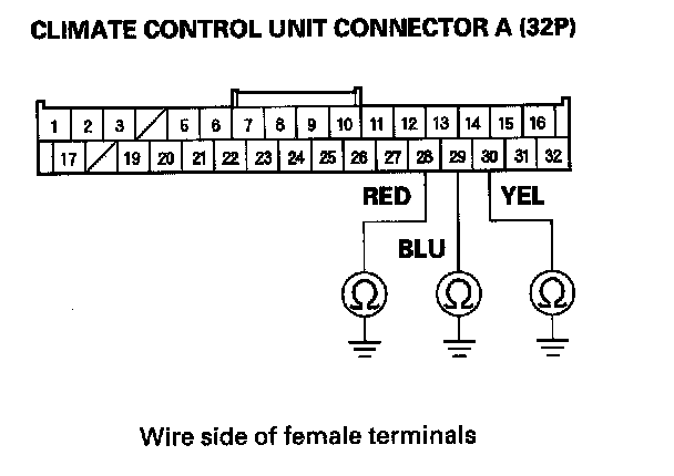 7. Check for continuity between body ground and climate control unit connector A (32P) terminals No. 28, 29, and 30 individually.