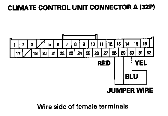 10. Connect climate control unit connector A (32P) terminals No. 28, 29, and No. 30 with a jumper wire.