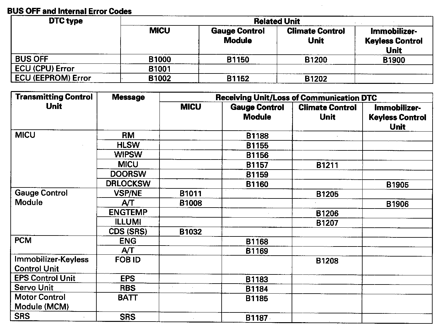 While in Test Mode 1, the DTCs which have been detected and stored individually by various B-CAN (Body-controller Area Network) units, will be shown one by one on the odometer/trip meter display when the communication between the MICU and the gauge control module (tach) is normal. To scroll through the DTCs, press the select/reset button.