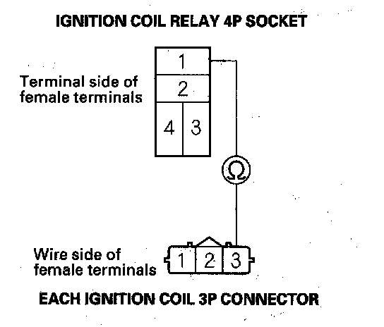 NO-Repair open in the wire between ignition coil relay 4P socket terminal No.1 and each ignition coil 3P connector terminal No. 3.