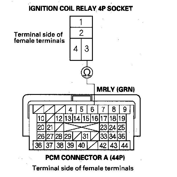NO-Repair open in the wire between ignition coil relay 4P socket terminal No.3 and the PCM (A6).