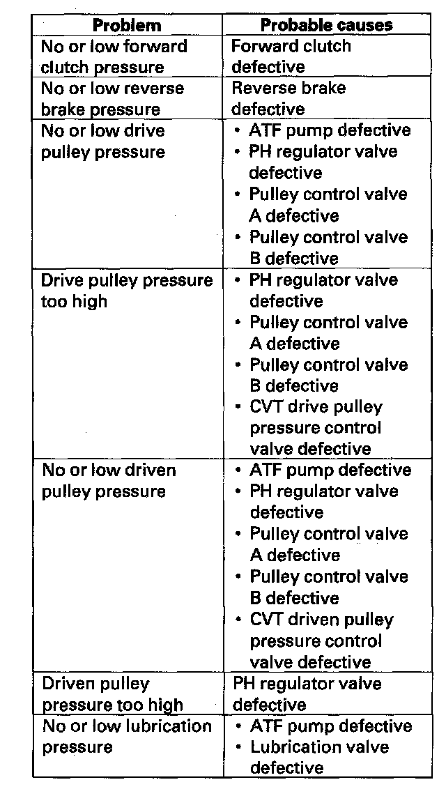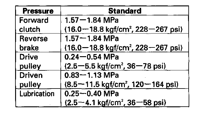 ^ Drive pulley pressure and driven pulley pressure may be above 3,430 kPa (35.0 kgf/cm2, 4,989 psi) when there is a transmission problem that causes the PCM to go into fail-safe mode.