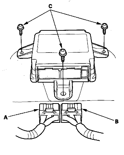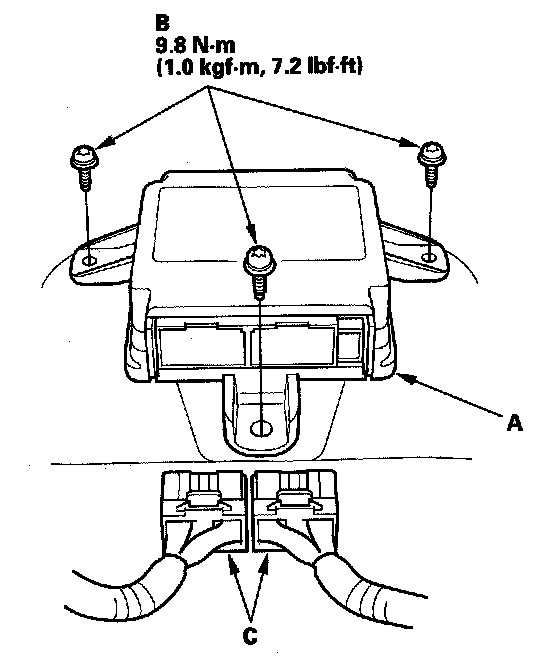 1. Install the new SRS unit (A) with TORX bolts (B), then connect the connectors (C) to the SRS unit-push them into position until they click.