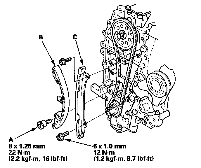 ^ 1 Hold the pulley with the holder handle (A) and pulley holder attachment (B), then tighten the bolt to 37 Nm (3.8 kgf-m, 27 ft. lbs.) with a torque wrench and a heavy duty 19 mm socket (C). If the pulley bolt or crankshaft are new, tighten the bolt to 177 Nm (18.0 kgf-m, 130 ft. lbs.), then remove the bolt and tighten it to 37 Nm (3.8 kgf-m, 27 ft. lbs.).