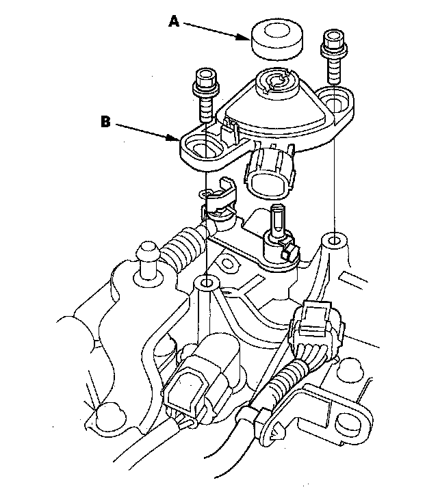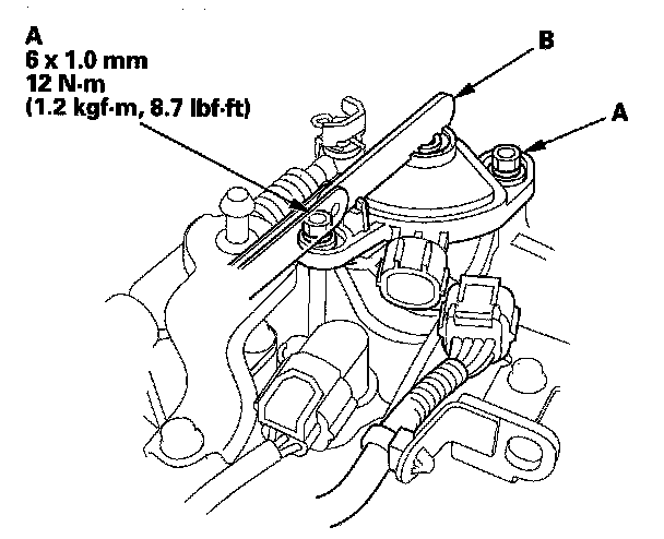 8. Tighten the bolts (A) on the transmission range switch while you continue to hold the N position. Do not move the transmission range switch when tightening the bolts. Remove the feeler gauge (B).