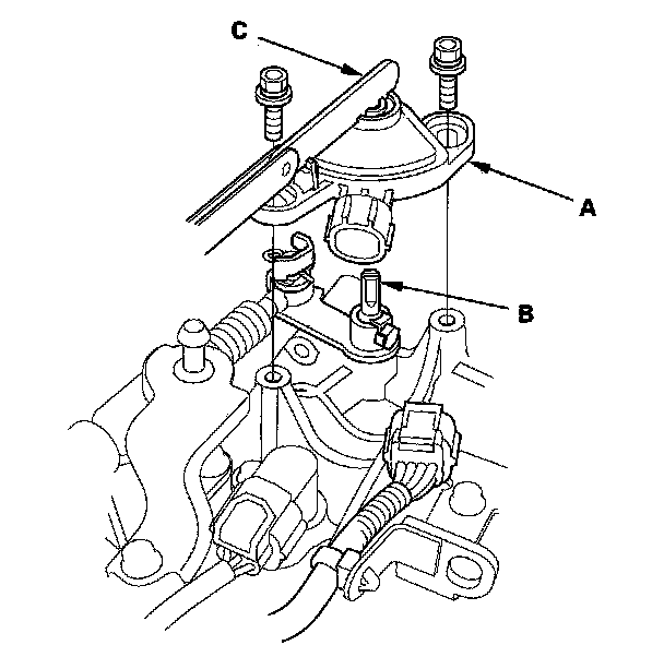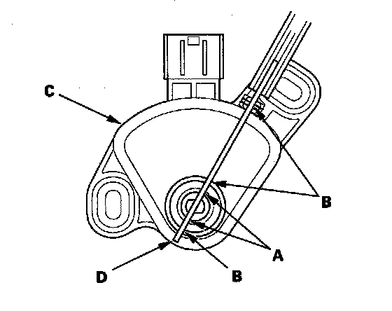 6. Align the cutouts (A) on the rotary-frame with the neutral positioning cutouts (B) on the transmission range switch (C), then put a 2.0 mm (0.08 in.) feeler gauge blade (D) in the cutouts to hold the switch in the N position.