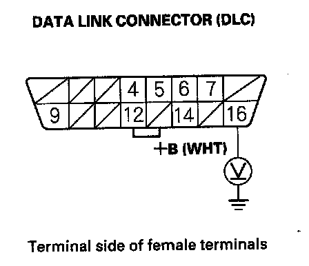 23. Measure voltage between DLC terminal No. 16 and body ground.