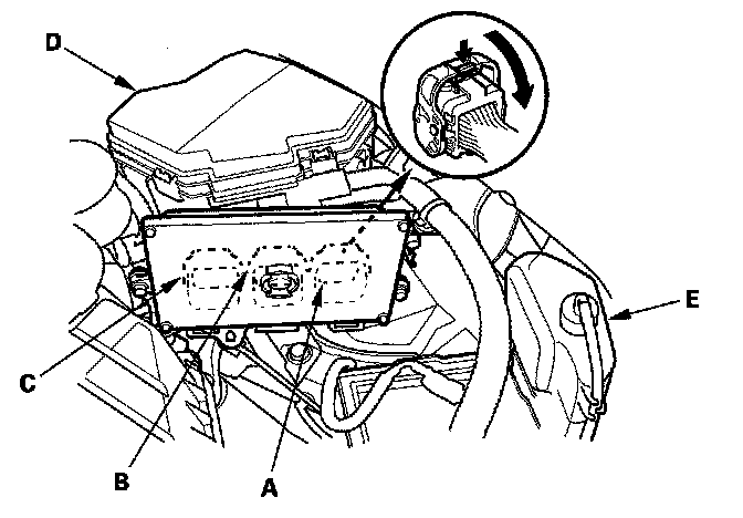 4. Remove the coolant reservoir (E). Disconnect the PCM connectors A, B, and C.