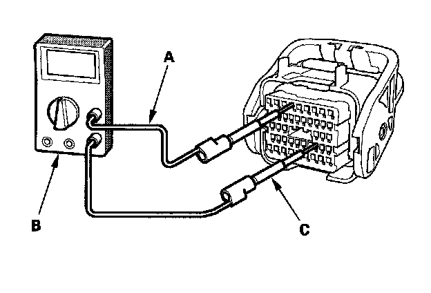 6. Connect one side of the patch cord (A) terminals to a commetcially available digital multimeter (B), and connect the other side of the patch cord terminals to a commercially available banana jack (Pomona Electronics Tool No. 3563 or equivalent) (C).