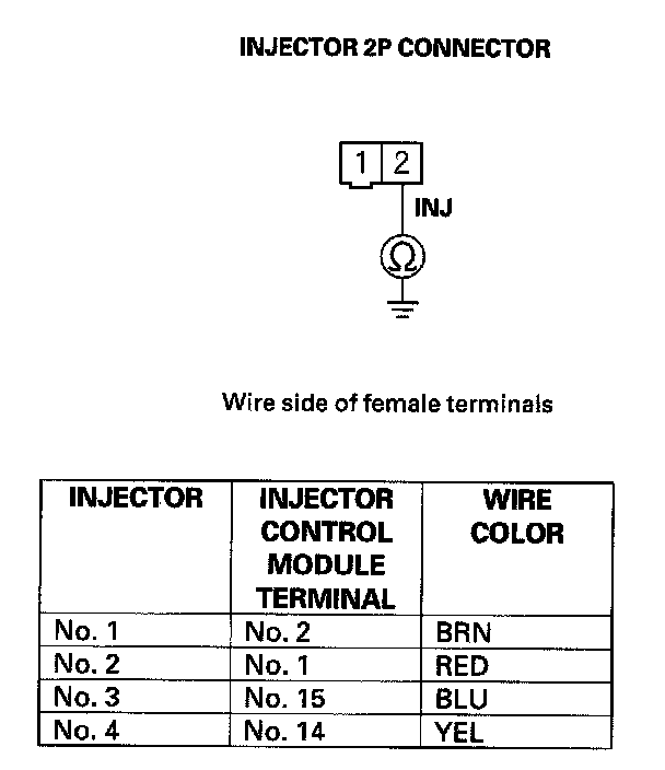 4. Check for continuity between each injector 2P connector terminal No. 2 and body ground (see table).