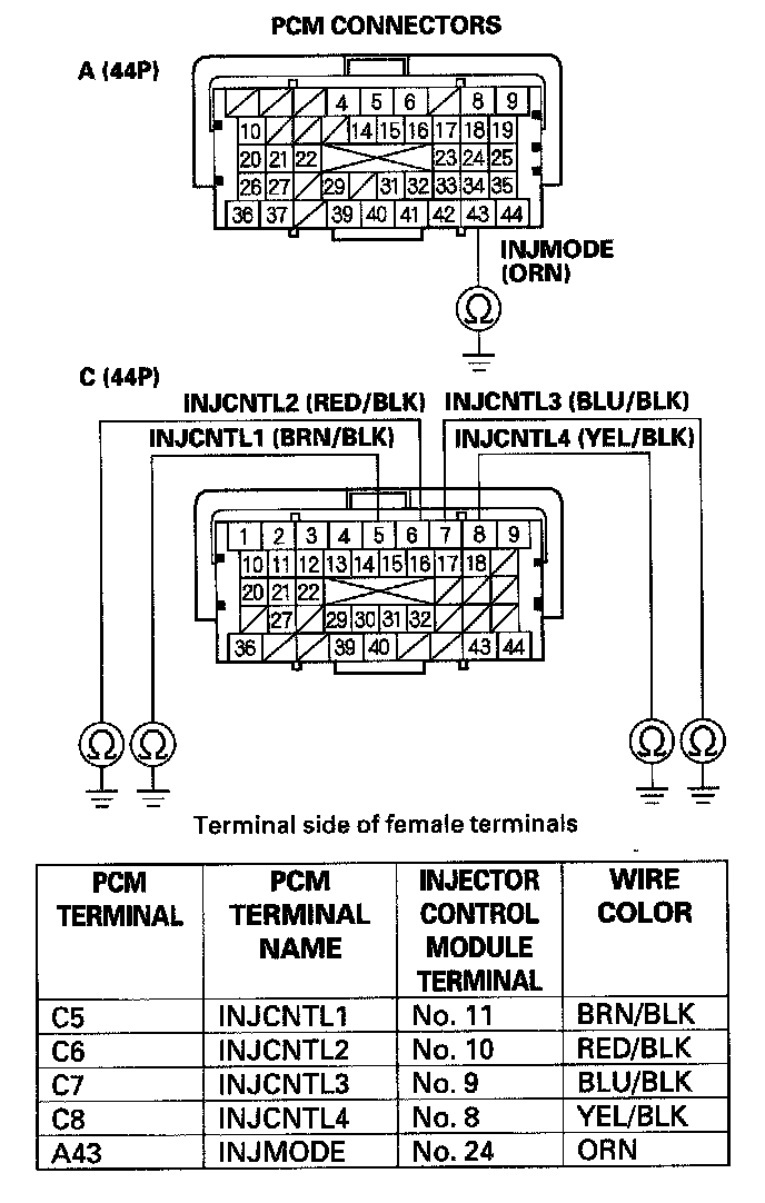 9. Check for continuity between body ground and the PCM connector terminals (see table).