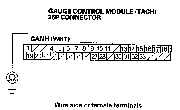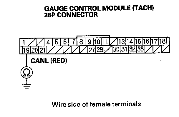 15. Check for continuity between gauge control module (tach) 36P connector terminal No. 19 and body ground.