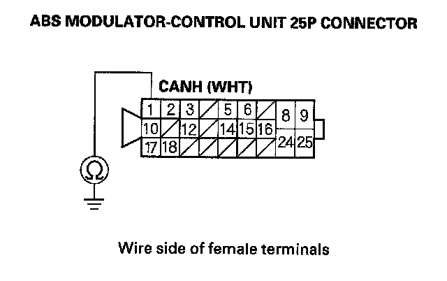 11. Check for continuity between ABS modulator- control unit 25P connector terminal No. 1 and body ground.