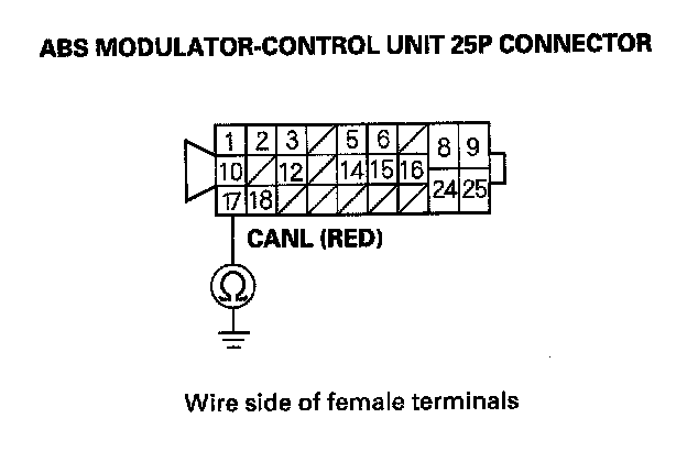 16. Check for continuity between ABS modulator control unit 25P connector terminal No. 17 and body ground.