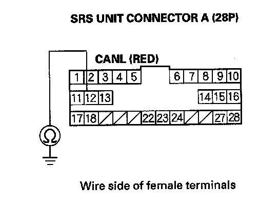 17. Check for continuity between SRS unit connector A (28P) terminal No. 12 and body ground.