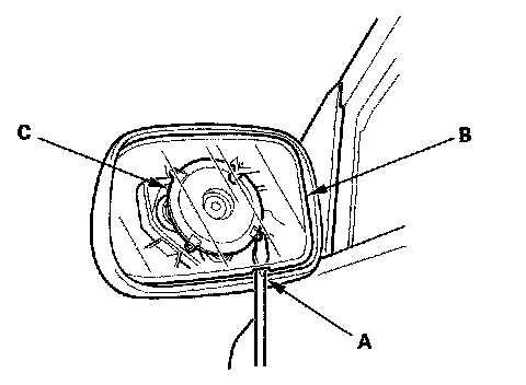 2. Insert a long, thin flat-tipped screwdriver along the notch (A) on the mirror holder (B). Slide the tip of the screwdriver between the mirror holder and the actuator (C).