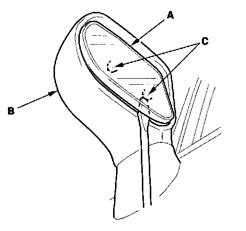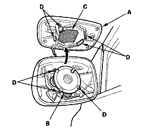 5. Separate the mirror holder (A) from the actuator (B) by slowly pulling the mirror apart while separating the adhesive (C), and release the hooks (D). If equipped, disconnect the mirror defogger connectors from the heater pad terminals.