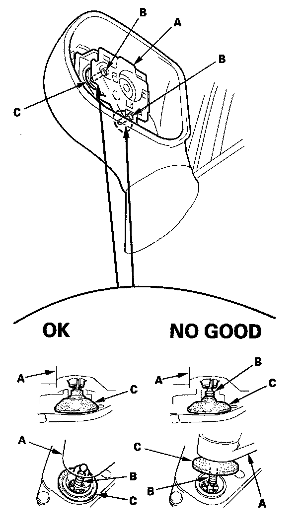 5. Before reinstalling the mirror holder to the inner holder (A) of the actuator, check the actuator rods (B) and the actuator boots (C):