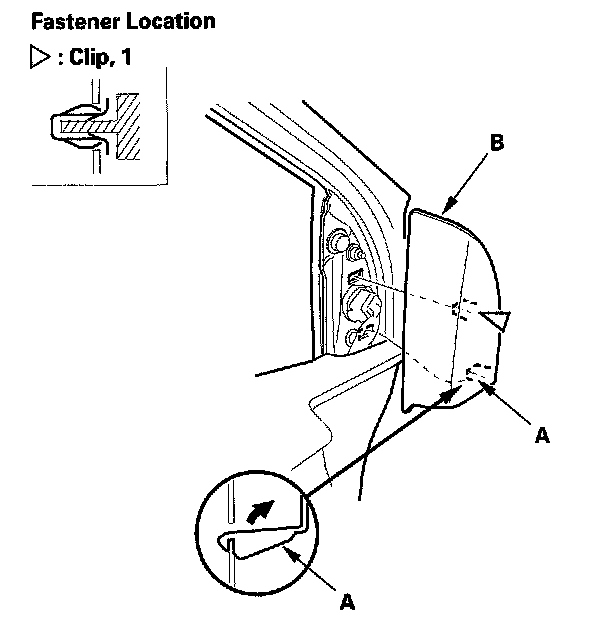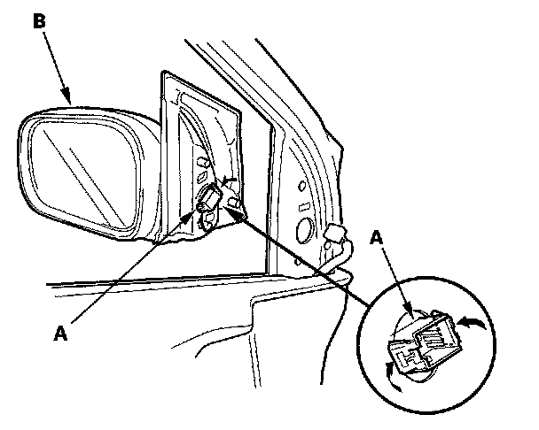 5. While holding the mirror, push in on the connector clip (A), then push out to remove the mirror (B). Take care not to scratch the door.