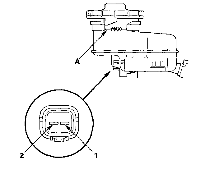Brake Fluid Level Switch TestCheck for continuity between the terminals (1) and (2) with the float in the down position and in the up position.