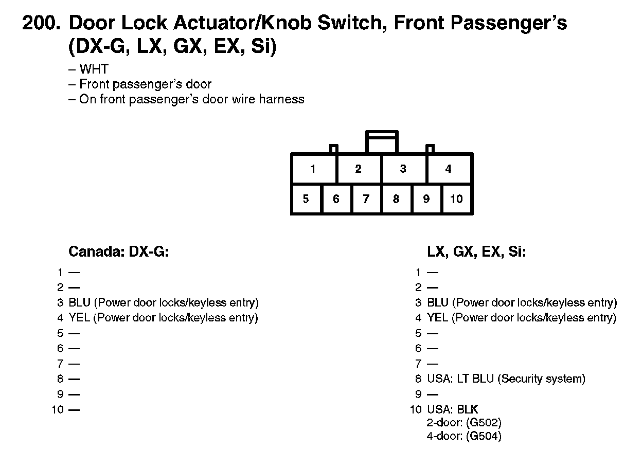 200. Door Lock Actuator/Knob Switch, Front Passenger's (DX-G, LX, GX, EX, Si):