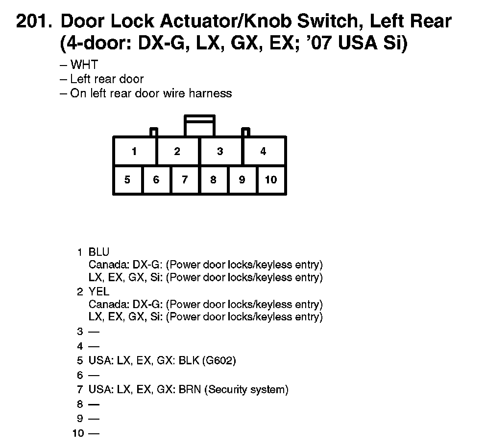 201. Door Lock Actuator/Knob Switch, Left Rear (4-door: DX-G, LX, GX, EX; '07 USA Si):