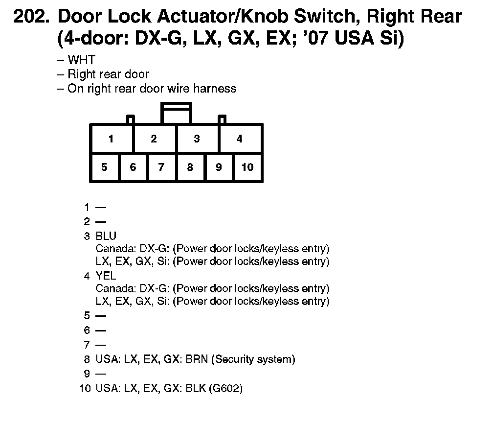 202. Door Lock Actuator/Knob Switch, Right Rear (4-door: DX-G, LX, GX, EX; '07 USA Si):