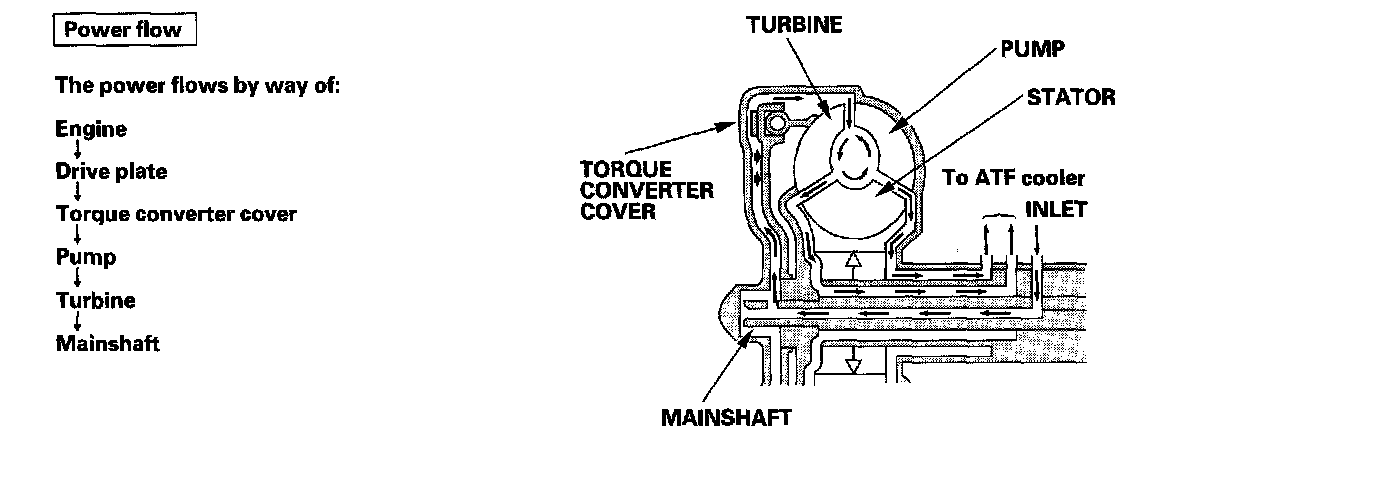 Fluid entered from the chamber between the torque converter cover and the torque converter clutch piston passes through the torque converter and goes out from the chambers between the turbine and the stator, and between the pump and the stator. As a result, the torque converter clutch piston moves away from the torque converter cover, and the torque converter clutch lock-up is released; torque converter clutch lock-up OFF.