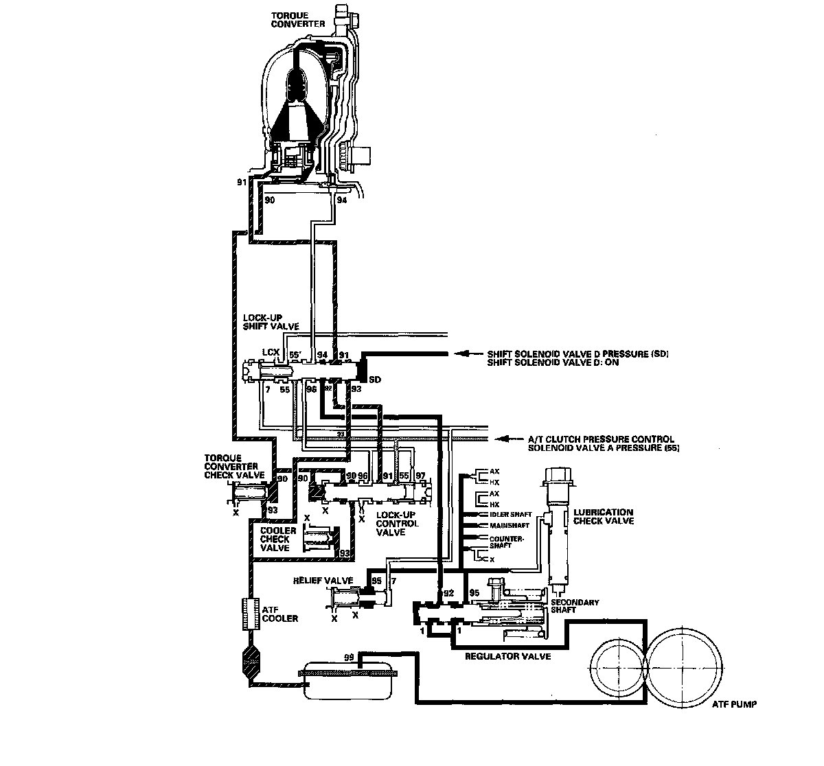 As the speed of the vehicle reaches the programmed value, the PCM turns shift solenoid valve D ON. Shift solenoid valve D pressure (SID) is applied to the right end of the lock-up shift valve to switch the torque converter pressure port leading to front of the torque converter. Torque converter pressure (91) enters into the front of the torque converter to engage the torque converter clutch piston. The PCM also controls A/T clutch pressure control solenoid valve A to regulate A/T clutch pressure control solenoid valve A pressure (55), and A/T clutch pressure control solenoid valve A pressure (55) is applied to the lock-up control valve. Torque converter pressure (94) drained from the back of the torque converter is applied to the right side of the lock-up control valve, and torque converter pressure (90) is applied to the left side of the lock-up control valve. The lock-up control valve controls the amount of the lock-up by receiving these pressures. The torque converter clutch is engaged partially during torque converter pressure (90) in the left side of the lock-up control valve is higher, and the torque converter clutch is engaged securely according to amount of pressure in the right side of the lock-up control valve. Under this condition, the torque converter clutch is engaged by pressure entering into the front side of the torque converter; this condition is partial lock-up.