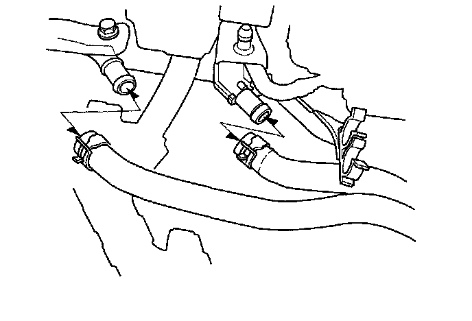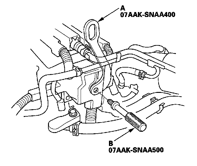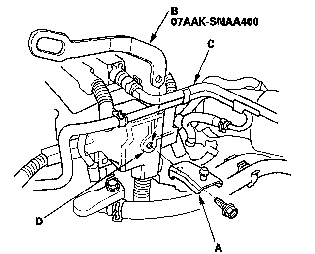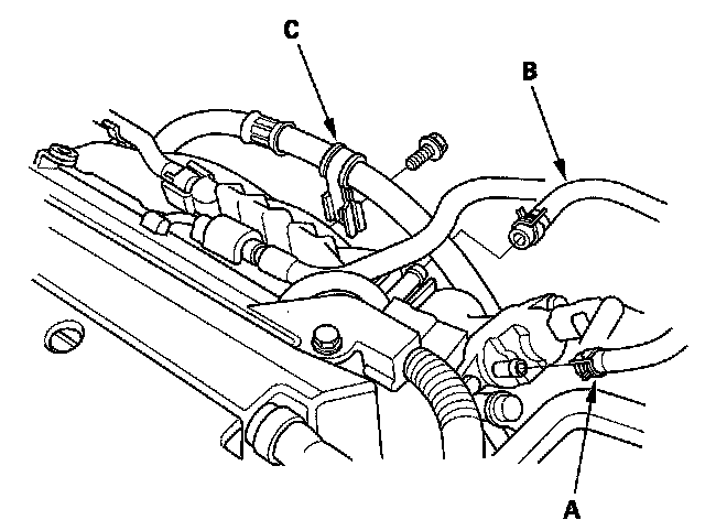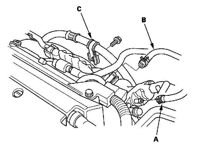 10. Remove the evaporative emission (EVAP) canister hose (A), brake booster vacuum hose (B), and power steering (P/S) hose clamp (C).