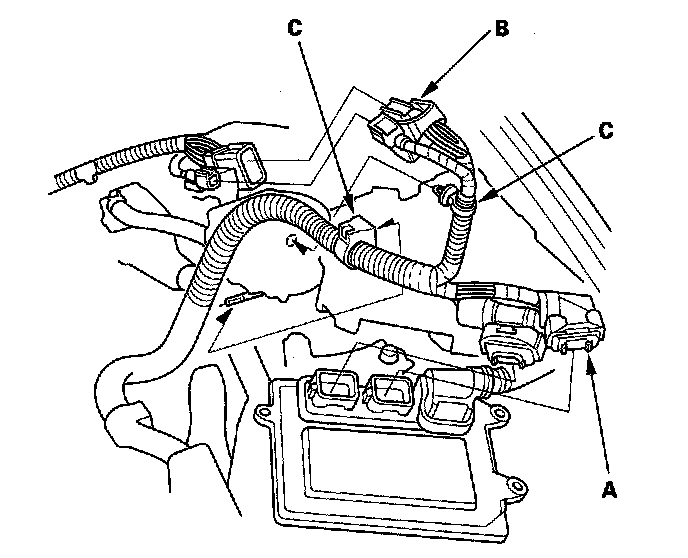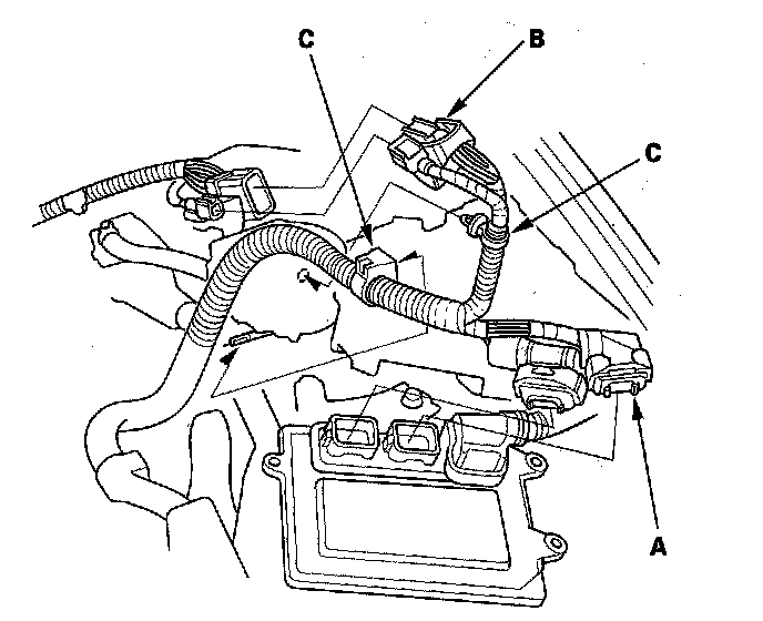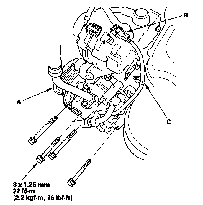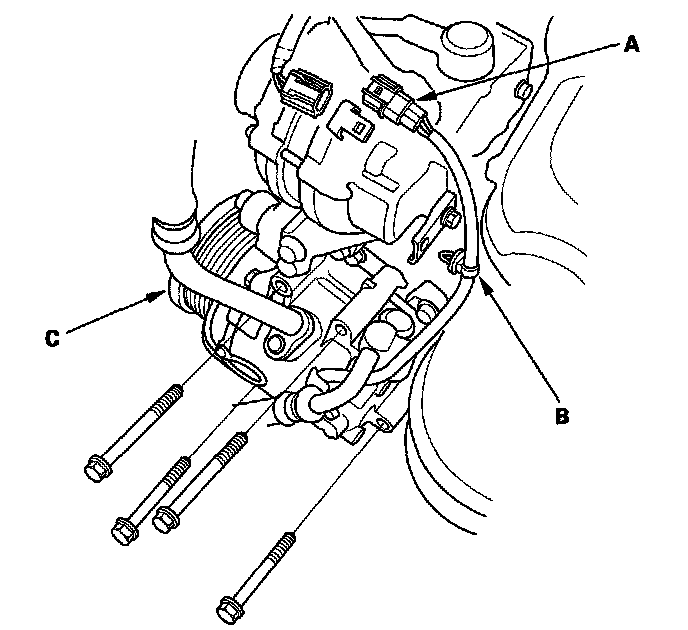 35. Connect the A/C compressor clutch connector (B), then install the harness clamp (C).