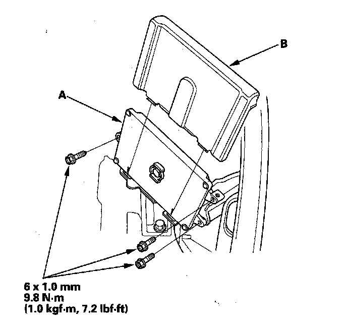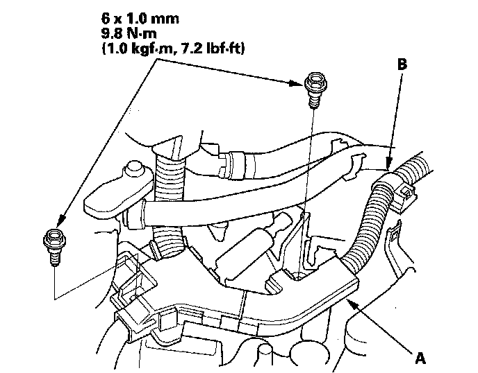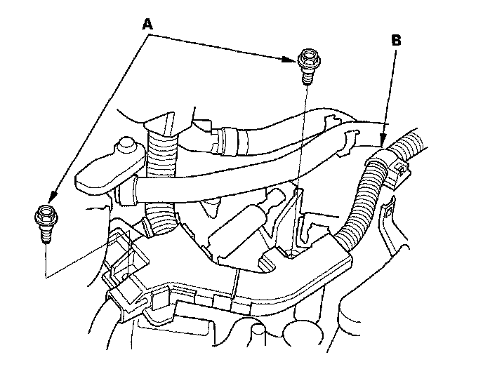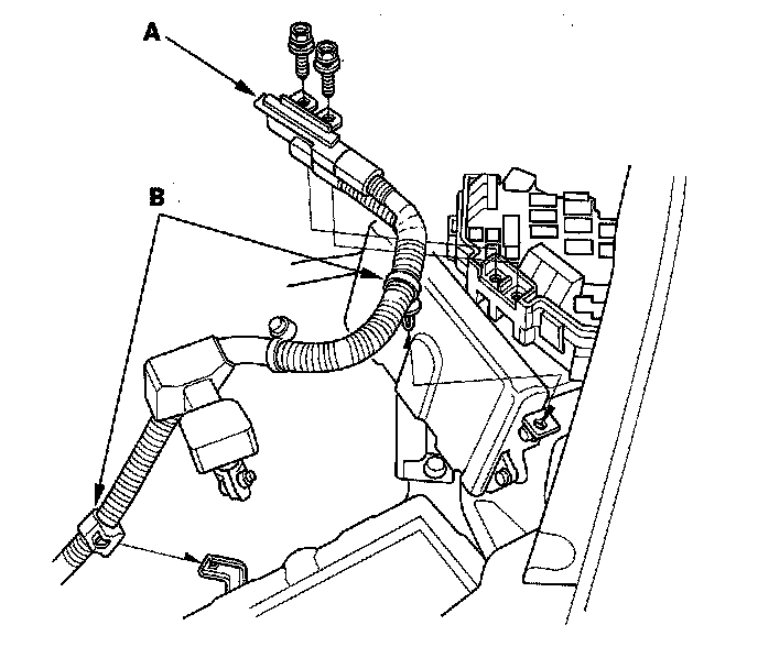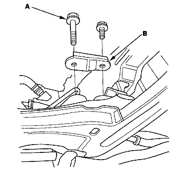 16. M/T model: Remove the two bolts (A) securing the harness holder, then remove the harness clamp (B).