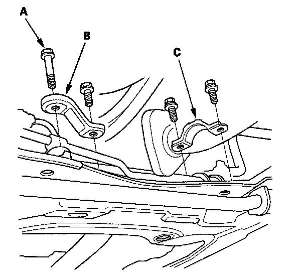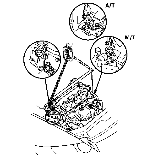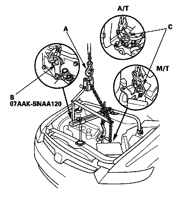 54. Attach a chain hoist (A) to the special tool (B) and transmission hook (C). Lift up on the engine/transmission until it's securely supported by the chain hoist, and remove the engine support hanger from the engine and vehicle.