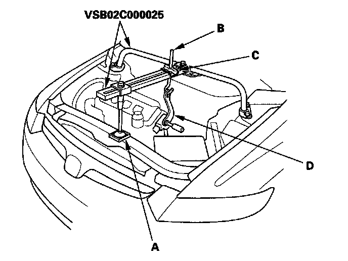 5. Install the front leg assembly (A), hook (B), and wing nut (C) from an A and Reds engine support hanger (AAR-T-12566) onto the engine hanger. Carefully position the engine hanger on the vehicle, and attach the hook to the slotted hole in the support eyelet (D). Tighten the wing nut by hand to lift and support the engine/transmission.