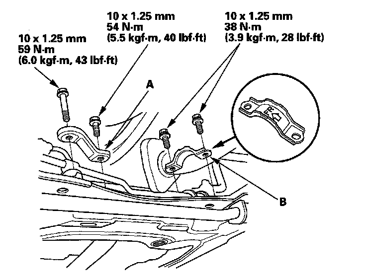 24. Install the power steering (P/S) line on the clamp (A), then install the P/S line brackets (B) on the subframe.
