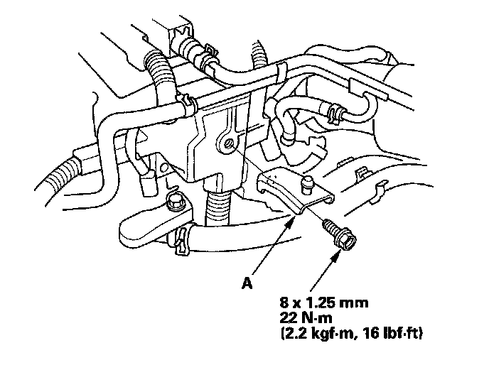 21. Install the steering gearbox stiffener (A), then tighten the steering gearbox mounting bolt and stiffener bolt.