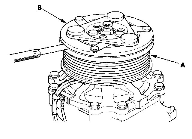 3. Measure the clearance between the rotor pulley (A) and the armature plate (B) all the way around. If the clearance is not within specified limits, remove the armature plate and add or remove shims as needed to increase or decrease clearance.