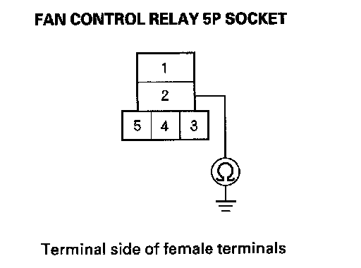 5. Check for continuity between the fan control relay 5P socket terminal No. 2 and body ground.