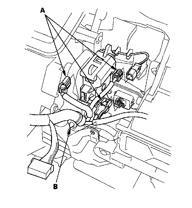 10. Disconnect the connectors (A) from the mode control motor, the evaporator temperature sensor, and the power transistor. Remove the wire harness clip (B).