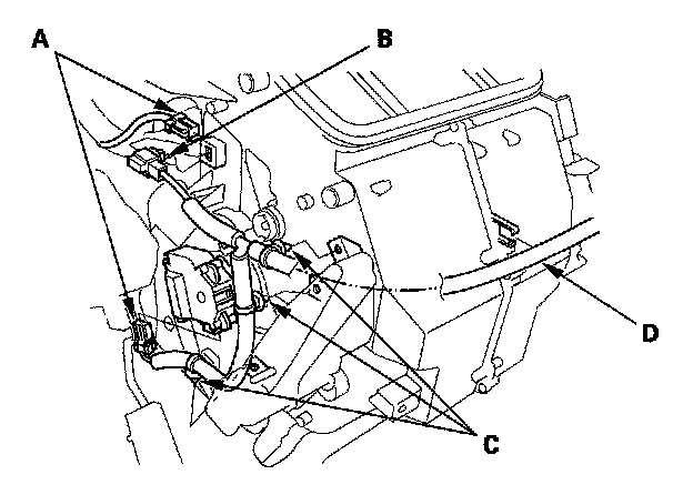 11. Disconnect the connectors (A) from the air mix control motor and A/C wire harness. Remove the connector clip (B), the wire harness clips (C), and the wire harness (D).