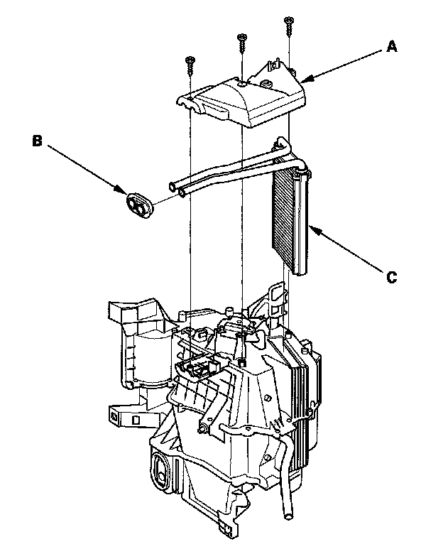 13. Remove the self-tapping screws, the heater core cover (A), the grommet (B), and carefully pull out the heater core (C).