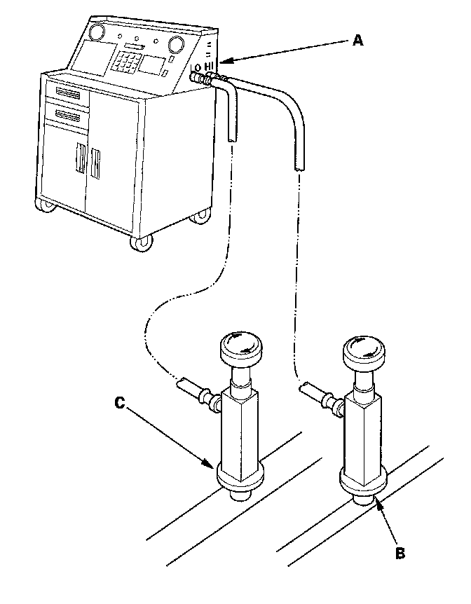 1. Connect an R-134a refrigerant recovery/recycling/charging station (A) to the high-pressure service port (B) and the low-pressure service port (C), as shown, following the equipment manufacturer's instructions.