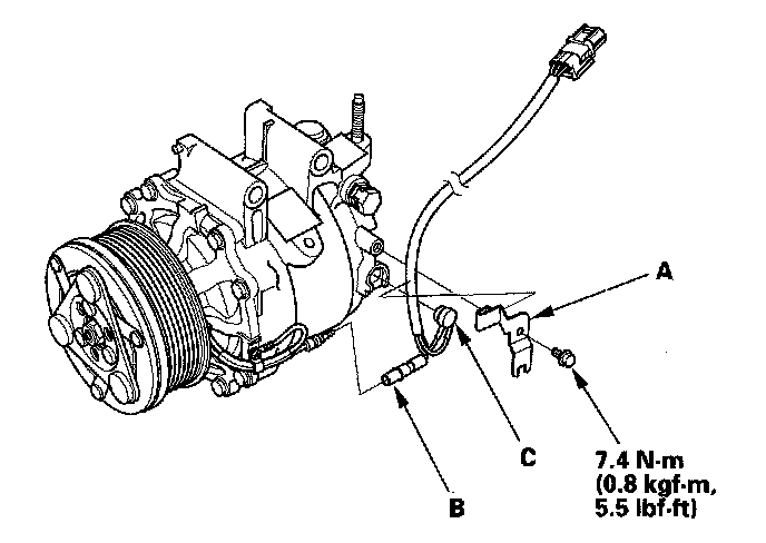 A/C Compressor Thermal Protector Replacement1. Remove the bolt and the holder (A). Disconnect the field coil connector (B), then remove the thermal protector (C).