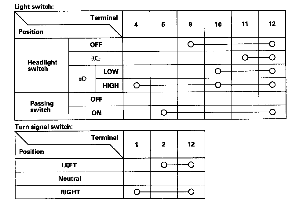 - If the terminals look OK, check for continuity between the terminals in each switch position according to the tables.